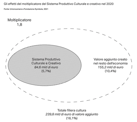Tutti questi ambiti rappresentano un patrimonio nazionale che esula dal “produttivismo industriale ed economico”, in quanto frutto di creatività, ma rappresentano una quota pari al 5,7% del PIL, per circa 84,6 miliardi di euro e 1.450.000 occupati, e contribuiscono ad attivare un moltiplicatore pari a 1,8 – cioè generano un volume in diritti, biglietteria, affari, addetti e produzioni collaterali di servizio pari a 155,2 miliardi di euro, pari al 10,4% del PIL Italiano. La filiera complessiva della cultura, che include anche mobilità, turismo, ristorazione, ospitalità, arriva a 239,8 miliardi, pari al 16,1% del PIL. In questo senso, si comprende attraverso numeri reali che arte, creatività e cultura producono volumi economici consistenti per lo sviluppo del paese, e ne costituiscono un asset paragonabile se non superiore a quello di cui altri paesi dispongono, diversamente dall’Italia, come le risorse naturali, minerarie, forestali (Stati Uniti, Canada, Norvegia, Russia).