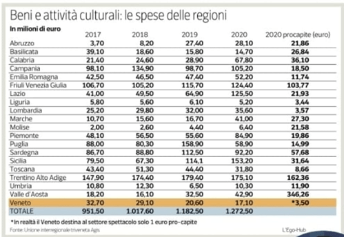 Purtroppo, dal punto di vista della politica regionale per la cultura e l’arte, il Veneto occupa un non invidiabile ultimo posto in Italia, come rivelato nelle ultime settimane da una indagine condotta dall’AGIS in occasione della definizione del bilancio di previsione 2022 della Regione Veneto. Pur trattandosi di legislazione “concorrente” che si affianca a quella nazionale espressa, appunto, per un diritto al sostegno sancito dalla Costituzione, questa carenza non è meno importante, se si considerano i 17 milioni della cultura nel confronto con i quasi 13 miliardi di bilancio annuo regionale (poco piu’ dell’1 per mille). Come conciliare questa relativa “disattenzione” della politica e dell’amministrazione per il patrimonio culturale, artistico e creativo del territorio, che contribuisce in maniera determinante al successo del “modello Veneto” e ai risultati economici delle esportazioni e del turismo? I turisti a Venezia, Padova, Verona, consumerebbero i pavimenti se non vi fossero monumenti, opere artistiche, teatri, musica, biblioteche, spazi di cultura storica e moderna? In fondo, turisti e consumatori comprano i prodotti veneti per il loro contenuto artistico unico, lo stile, il loro design, la loro eredità culturale e storica e la qualità del prodotto, assicurata dalla competenza e dalla cultura delle maestranze e degli imprenditori. Analogamente, le arti creative (pittura, scultura, scrittura), la musica, il teatro, la danza, lo spettacolo rappresentano altrettante realtà economiche, “servizi” che sono essenziali per assicurare il godimento del turista in viaggio, oppure la scelta del consumatore all’estero, nella fruizione di spettacoli in streaming, registrati, dal vivo – si pensi all’opera musical realizzata da Red Canzian, “Casanova”, sullo scritto del padovano Strukul, e la musica dell’Orchestra di Padova e del Veneto. L’Orchestra, dal canto suo, nel 2020 ha messo tutto il suo patrimonio musicale storico in streaming, attraverso il portale “opvlive.it”.