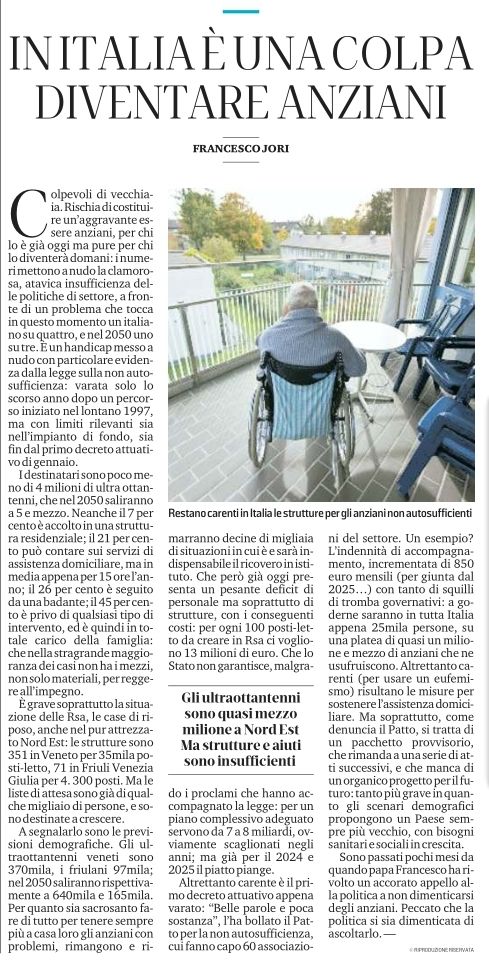 L’autore suggerisce che la soluzione non può essere solo l’aumento dei “decreti flussi” per i migranti. È necessario un piano strategico che programmi l’arrivo, l’inserimento e la formazione dei migranti, offrendo loro case e servizi sociali. Occorre inoltre investire in educazione, formazione professionale e welfare, evitando l’iper-urbanizzazione e fornendo professionisti qualificati per l’industria, l’edilizia e i servizi. L’articolo conclude che il problema è reale e non un semplice presagio. La società italiana, caratterizzata da una mentalità giovanilistica e consumistica, tende a ignorare o a minimizzare i problemi legati all’invecchiamento. È necessario che politica, economia e terzo settore diano una risposta collettiva per garantire un’assistenza adeguata e dignitosa a tutti. L’autore stesso aveva già affrontato il tema nel 1993, riconoscendo che se non si fosse intervenuto, il problema sarebbe diventato ingestibile.