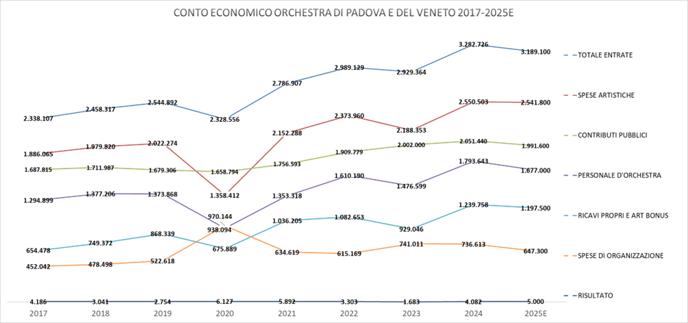 Si’, è cresciuta in valore assoluto del 34,3% in volume di attività a valore costante dal 1974, nonostante a molti pessimisti questa forma espressiva musicale di spettacolo dal vivo sembri oggi “desueta”, e destinata ad estinguersi. Questa prima considerazione rende evidente che l’attività musicale della Fondazione, nonostante un ambiente culturale e territoriale veneto e padovano complesso, la costante concorrenza di altre istituzioni regionali e locali, la concorrenza dei conservatori finanziati al 100% dallo Stato, e quella delle Fondazioni Lirico Sinfoniche, finanziata a piè di lista, trova nelle conferme artistiche una propria ragione d’essere e, come si è detto, nonostante si parli di una “vecchia istituzione”, l’Orchestra di Padova e del Veneto non è una “istituzione vecchia”, ma viceversa rinnova il proprio ruolo nel tempo, aumentando in dimensione e in volume d’affari, come può accadere per una entità non prevalentemente economica e senza finalità commerciali, ma espressiva di una reale esigenza di spettacolo, formativa, culturale ed artistica che mantiene radici solide anche nel mondo moderno. Si può, inoltre, osservare che la contribuzione pubblica è sempre stata abbastanza consistente nella storia dell’Orchestra di Padova e del Veneto, adempiendo sostanzialmente alla finalità di assicurare il turnover e il mantenimento della massa artistica di musicisti, direttori e solisti, mentre la crescita “netta” attivata negli ultimi dieci anni (2015-2025) può essere ascritta principalmente allo sviluppo di due rilevanti fenomeni, oltre la capacità artistica e la bontà e attrattività dei programmi di spettacolo: dal 2018 l’applicazione dell’istituto fiscale dell’Art Bonus (detrazione del 65% delle donazioni effettuate per attività dell’Orchestra) e l’aumento della committenza esterna da parte di enti e istituzioni in Italia, hanno permesso di elevare il differenziale tra contributi pubblici (Ministero della Cultura, Regione, Provincia, Comune) rispetto ai costi totali, assicurando una entrata complessiva dal “mercato” consolidata per quasi € 1.000.000,00 annuo negli ultimi anni, che per essere conseguito richiede un grande sforzo promozionale e commerciale, ma ha assicurato all’Orchestra una significativa crescita di investimenti (in software, adeguamento locali, personale tecnico amministrativo e formazione) e di organico orchestrale (oggi a 28 musicisti stabili inquadrati con contratto a tempo pieno ed indeterminato, contro i 22 presenti nel 2018). L’aumento della committenza esterna, che risulta evidente dall’analisi della Figura 2 (quota contributi sul totale dei ricavi: 72% nel 2017; 63% nel 2021, 62% nel 2024 e 2025), liberando maggiori risorse per lo sviluppo, ha permesso investimenti in pubblicità, immagine, qualità artistica, importanti solisti e direttori, nonché nel ricambio del personale professionale di supporto, che aumenta le referenze e la percezione dell’Orchestra a livello nazionale e internazionale, e la sua conoscenza diretta.