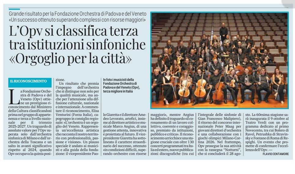 A seguito della pubblicazione dell’assegnazione dei contributi del Settore Musica dell’anno 2025 del Fondo Unico dello spettacolo (FUS) per la Musica, per il triennio 2025-27 la Fondazione Orchestra di Padova e del Veneto si è classificata prima nell’ambito del gruppo di appartenenza e terza per punteggio totale nazionale (quinta nel 2024) dopo l’Orchestra Sinfonica di Milano e l’Orchestra della Toscana. Un risultato che riconosce la qualità della proposta artistica e l’impegno culturale dell’Orchestra, fondato su un’attività concertistica composita e diffusa sul territorio nazionale e all’estero, eventi che hanno registrato un sensibile incremento di pubblico, soprattutto tra la generazione più giovane. Parte con un segnale importantissimo, quindi, la 60ª Stagione concertistica della Fondazione Orchestra di Padova e del Veneto, al terzo posto tra le 12 Istituzioni Concertistico Orchestrali italiane per qualità artistica, organizzazione, pubblico pagante e programma musicale. Il decreto del Direttore generale Spettacolo 23 luglio 2025, rep. n. 1125 recante determinazione di assegnazione dei contributi per l’anno 2025 nel settore Musica ai sensi del D.M. 23 dicembre 2024, n. 463, ha infatti premiato OPV mettendola al primo posto del suo “gruppo” sui tre complessivi. Il punteggio totale conseguito è di 80,16, al terzo posto tra le 12 istituzioni Concertistico Orchestrali riconosciute oggi in Italia.